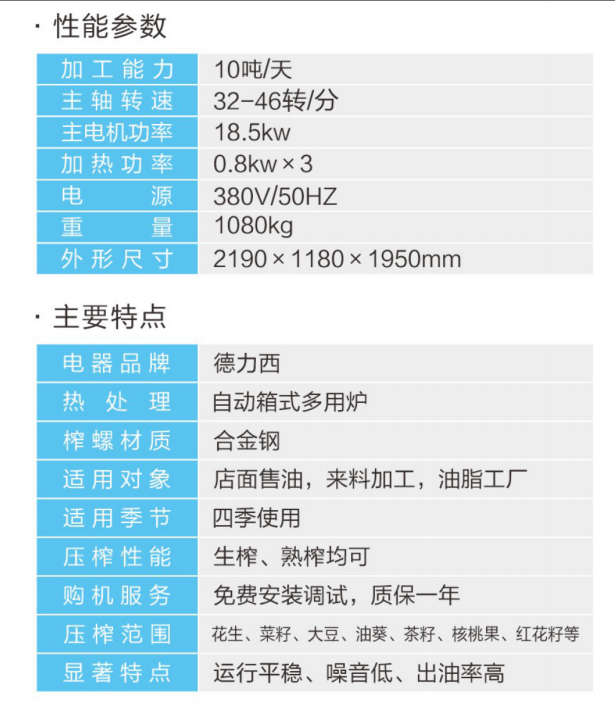 ★壓榨范圍:花生、大豆、菜籽、油葵、茶籽、芝麻等;★適用對象:店面油坊和微小油坊;★壓榨性能:熱榨一次榨盡,免費安裝調(diào)試